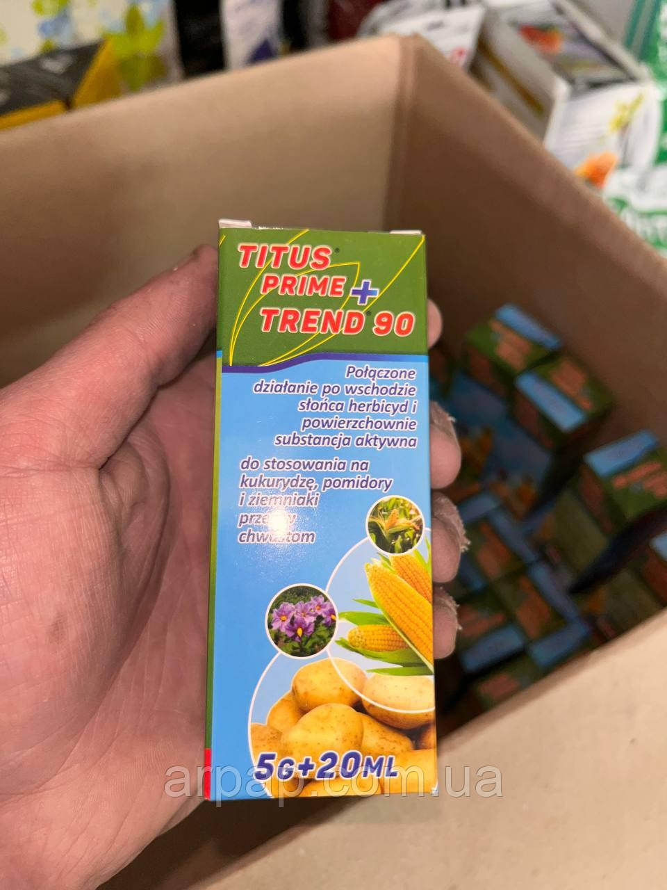 Послідовний гербіцид Титус у мікрогранулах використовується для контролю комплексу багаторічних і однолітник бур'янів у посівах картоплі та кукурудзи. Продукт ефективно знищує бур'яни, а прилипач Тренд, що йде в комплекті, неабияк покращує ефективність роботи гербіциду. Активна речовина гербіциду Титус римульфурон, який, проникаючи через листову поверхню, швидко переміщається до точки росту рослини, де зупиняє біосинтез, блокує ріст і ділення клітин, у такий спосіб запобігаючи подальшому росту бур'янів. Відразу після внесення препарату зазначається припинення росту бур'янів, а видимі симптоми в дії проявляються вже за тиждень після оброблення. Повна загибель бур'янів відбувається через 2-3 тижні після застосування засобу. Прилипач Тренд забезпечує покращене проникнення препарату через кутикулярний шар бур'янів і сприяє закріпленню робочого розчину на листовій поверхні. Завдяки прилипачу, засіб стійкий до змивання осадами. Якщо за кілька годин після оброблення піде дощ — це не вплине на якість роботи гербіциду. Гербіцид Титус ефективно застосовується в боротьбі проти гума, тріскача повзучого, вівсюга, курячого проса, палйчатки кровостануваючої, сорго двоколірного, амброзії, буряків польової, галінсери дрібнобарвної, гірчака, пастушини, пастушина сумки, хрестовника звичайного, канатника теофрасу, лебеди білої, осота, підсолоджувача чіпкого, реп'яха, риб'янистої, ромашки, підлаштування підзабірного, ручки лікувальної, соняшнику однорічного, щипці. Після використання препарату ріст бур'янів відразу зупиняється, а сам гербіцид швидко розкладається в ґрунті й не завдає шкоди довкіллю, водночас має тривалий термін захисту.